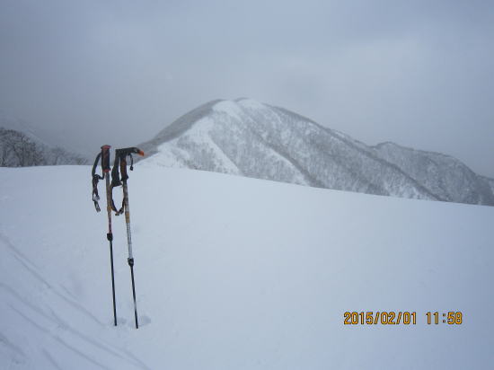 | 雪庇はありますが中央に乗り越しにふさわしい箇所がありました。 | 当初、稜線北方、国見岳を予定していましたが強風、天候悪化のためより近い南方の大禿山にしました。正面が国見岳。 |