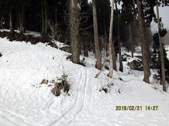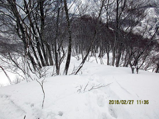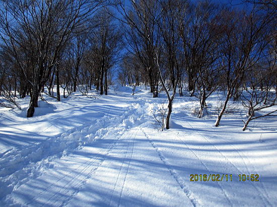 | 北面を滑ってきたトレースと合流しました。 | 国道を外して尾根の樹林帯を下降しました。 |