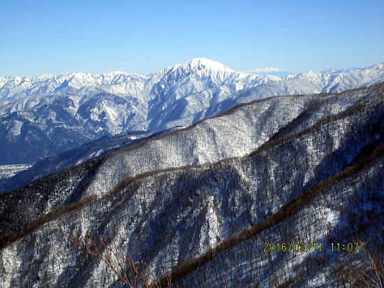 | 前山直下、なかなかの急斜面です。靴ラッセル程度の新雪があります。 | 前山からの大野盆地と経ヶ岳と白山。大野盆地も美しい。 |