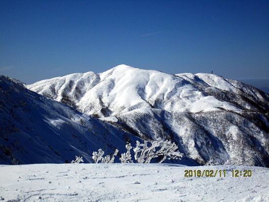 | 前回の位置で撮影。脛まで埋まる新雪。 | 山頂に到達できなかったことが心残りで、甲(かぶと)を何回も振り返る。 |