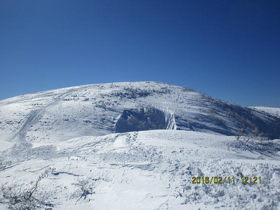 | 強風で 昼食は無理、カロリーメートを補助食として滑降口を偵察に行きます。先行者がいたらもう一つ東の沢も選択肢としました。 | 幸運なことに13時ですがノートラックです。 |