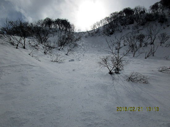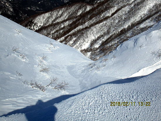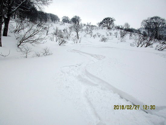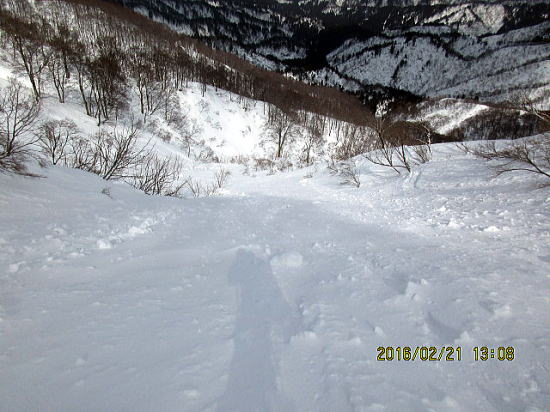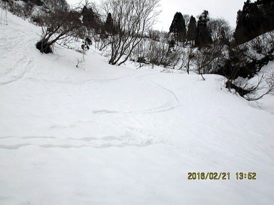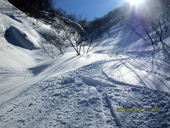 | 北面バーンを一滑り、テートン板はこの斜度では沈まずシュプールも浅いようです。 | バーンから沢部へ移行。 |