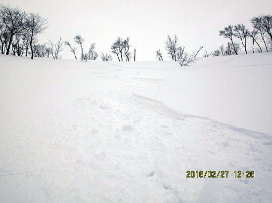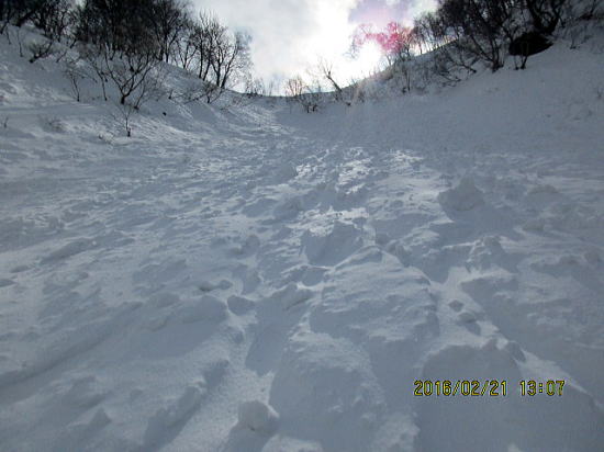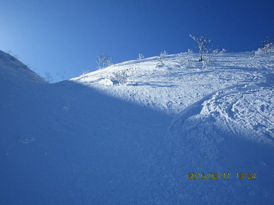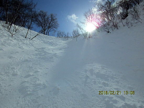 | 振り返れば厳しい凹凸。モーグルでもやってないと太刀打ち不能か。 | 後半良さそうは、外れました。表面クラスト、超手強い雪で2度転倒しました。 |