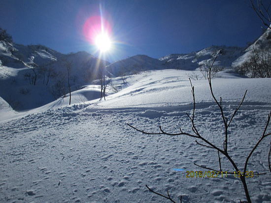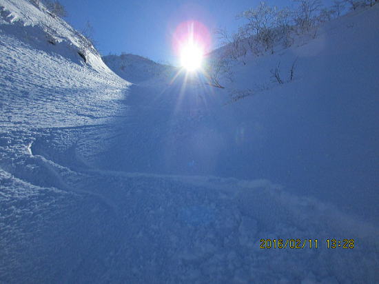 | 左岸のオープンバーンに移行してして一滑り。パック気味です。 | 一気に本谷滑降に入ります。 |
