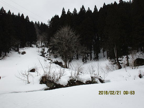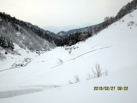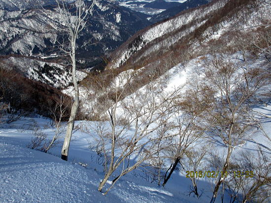 | 左岸から右岸へきました。シールなしでは蟻地獄になりそうです。 | 台地から志目木谷左俣を望む。 |