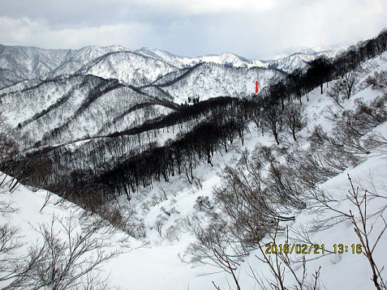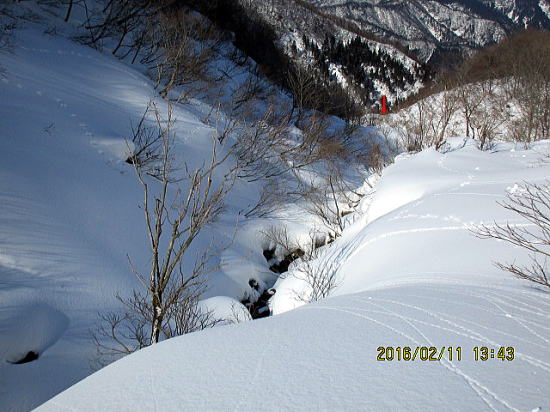 | 沢底を滑ってから登り返しという手もありますが、初の下降ルート、今日は地図なし、GPSだよりなので右岸斜滑降トラバースで、鞍部↓付近(方角)をめざします。 | 右に沢底が見えています。 |