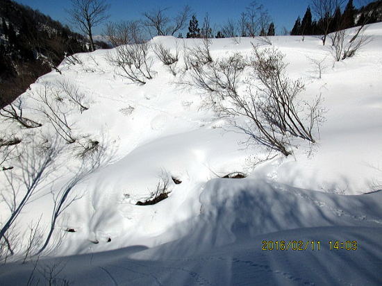 | 斜度が幾分落ち中間部(私が決めただけ)ヤブが例年よりすごい。 | 灌木を避けながら進みます。 |