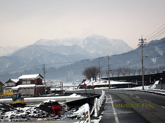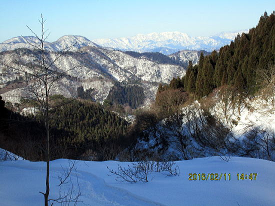 | 山頂です。大日山(中央)と滑りたいピーク。今日は山を変更したので地図無くGPSだよりなので自重します。 | 南方面、勝山市と野向町が見えています。 |