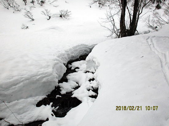 | 5分もすると取り付きます。 | 昨年は2~3mあった積雪も今年は80㎝程度です。落ちても容易に脱出できる? |