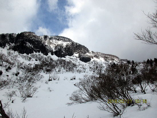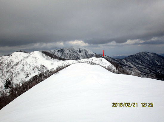 | 尾根通しで初めて登り切りました。いつもは最後の急登でトラバース。 | 強風が少しおさまりましたが、雲が増えてきました。 |