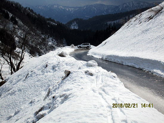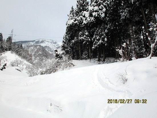 | 除雪してあると車でついつい上がってしまおうとするのが人の性(さが)。雪が全面ならばもっと下に駐車するのになぁ。(駐車地より振り返る) | 一部スキーを担いで除雪終了地点にきました。 |