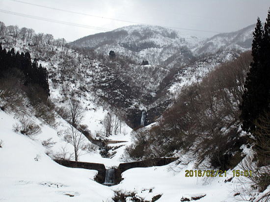 | 前日の降雪のため本来の駐車地から出発でうれしくなる。 | ここが先週の駐車地、八反滝前です。 |