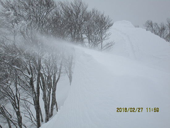 | 山頂はもう少しですがあと30分はかかりそうです。所用のため12時をリミットとします。 | 稜線上は風の通り道、雪庇のできる現場をもてびっくり、この日は冬型で北風ですがこの箇所は南風で北に向けて雪庇ができてます。 |
