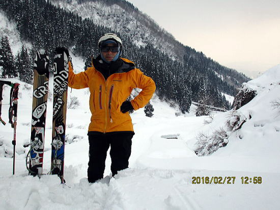 | さら右岸をしばらく滑ってから左岸へ移るポイントを探します。比較的斜度が緩いところがあります。対岸には志目木谷右俣からの先行者のトラックが見えました。さてつながっているだろうか。 | 残念ながら渡渉です。対岸からスキーを放り、雪壁をよいしょです。片ウィペットでしたが役立ちました。同士のギヤ、グランドテートンです。 |