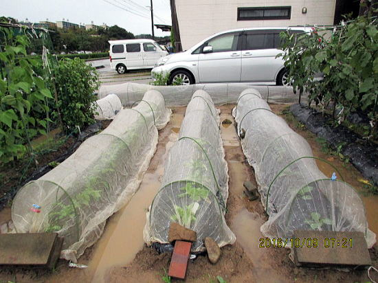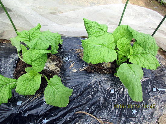 | 10/9ダイコンもこれまで暑かったのでトンネル付きです。 | 10/23ようやくカブも虫に勝てる大きさになりました。 |