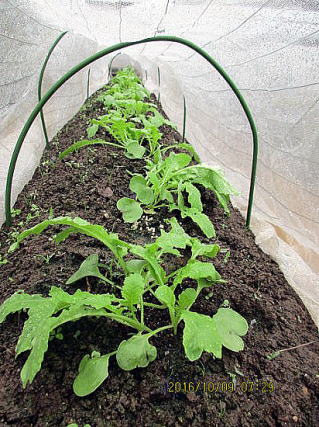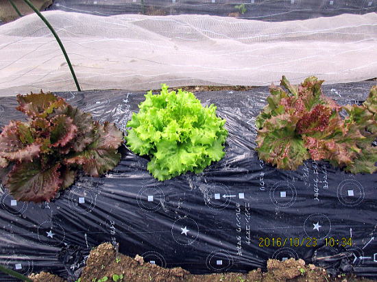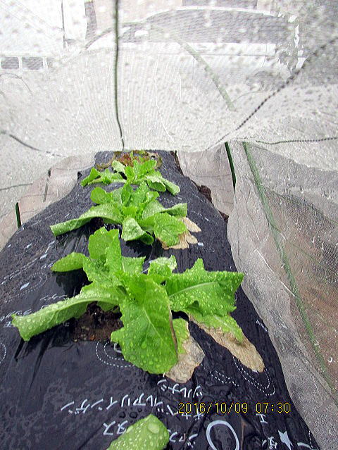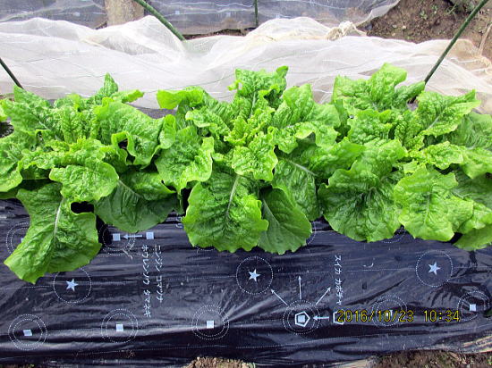 | 10/23 2週間でもう収穫ができるようになりました。下部は15㎝の葉の大きさです。下葉を取ると上の葉が大きく成長するようです。 | 10/23 サニーレタス、サンチュは中央列。生食するので薬剤なし、ネットできれいにしておきましょう。 |