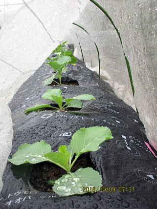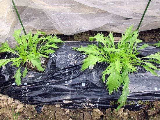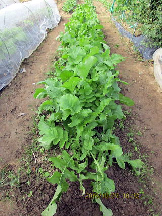 | 10/23 ミズナは始めはゆっくり、途中から急激に成長します。2株ずつ植わっているので間引く予定ですが、かわいそう?になってきました。 | 10/23 ポットで育てているときは、根腐れ状態で葉が黄色で、育つか心配しましたが、畑へ移植すると生気を取り戻し、一安心です。 |