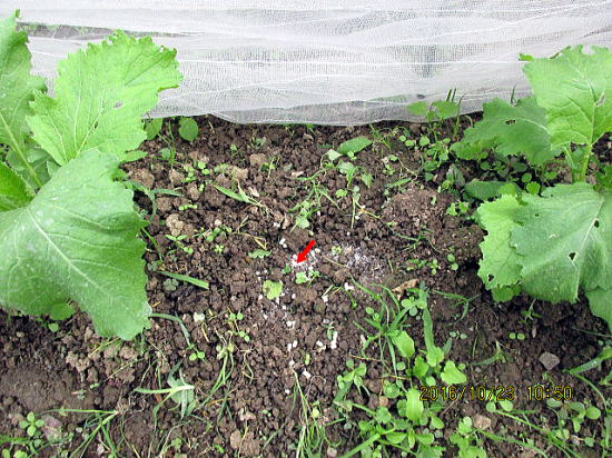 | 10/9左から① 左小トンネルはナバナ、②ダイコンとハクサイ列、③サンチュとサニーレタスとハクサイ列、④キャベツとブロッコリー列、⑤後列がカブとミズナです。右のなすの様子はこちらから。 | 10/9カブはずいぶん虫に食べられました。カタツムリ、あるいはよとう虫、白粒はナメクジ駆除剤です。 |