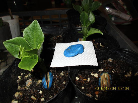 12/4 豆子たち 原野への出発 明日ひかえ これひと月の 成長ねぎらう 11月13日に種まきしてから一ヶ月近く、特にソラマメは2週間近くたって芽が出だす。3週たってようやく発芽を始めたソラマメ(右後ろ)もある。寒い時季の豆の発芽には根気を要す。 |