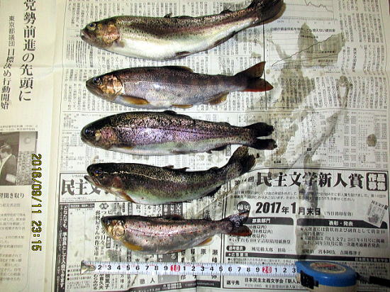 9月10日 今シーズンも5~8月は毎週のように夕方1時間~1.5時間楽しんだ。片道1時間15分で特に帰りの19時~20時15分は夜道でとても疲れたが、冬のタンパク源と思えばがんばれた。 今年はアマゴの20㎝以上はずっとお目にかかれなかったがようやく、台風の影響で水かさが増し魚の追いが良くなった。この日はアマゴ25㎝、17㎝、16㎝、ニジマス23㎝と大いに楽しめた。 |