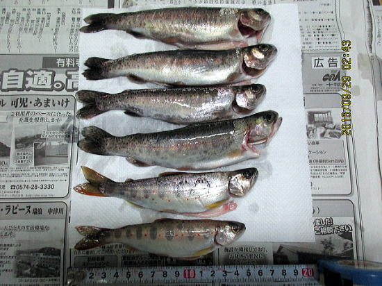 4月9日 職場の同僚の釣りばなしに喚起されて渓流釣りへ。久々の早朝4時半発。おかげさまで釣り人は私のみ。水温はそれ程低くないようだが、魚の活性が低く、小さいあたりが少しあるのみ。18~29㎝5匹。上4匹は今年度の放流もの、29㎝のみ天然化したものであった。 |