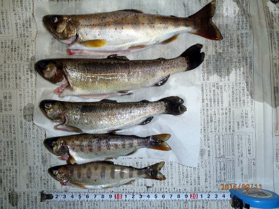 9月11日 昨日良い思いをしたので、普通は二日連続して釣りに行くことはないがシーズン終了間近ということで向かうと、約1時間で23㎝のニジマス、20㎝のアマゴと手応え十分であった。 |