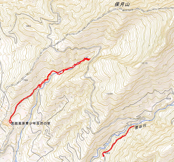 | 法音寺林道行けると思って進むと唐谷川でした。 | どうも宿谷川と地形が違います。林道が長すぎるので自然の家ノーマルルートにします。 |