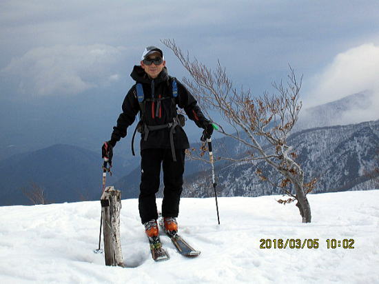 | 山スキー屋は私一人かと思いきや、この後林道から上がってきた大阪のペアに出会います。 | 前山で大阪の山スキー屋に撮影してもらいました。黄砂か?かすんでいます。 |