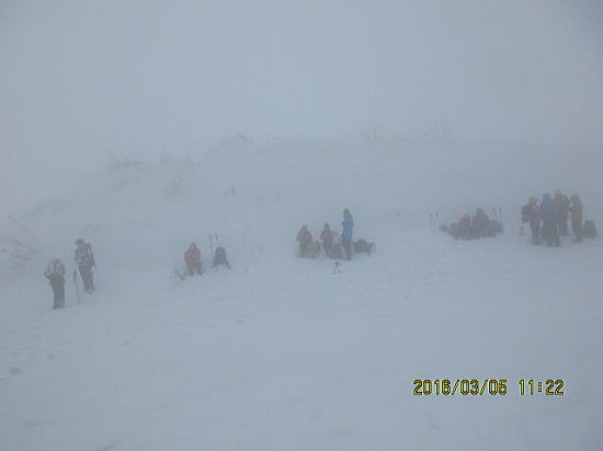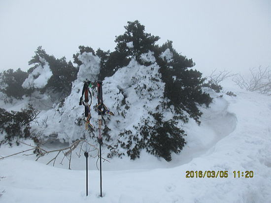 | 山頂付近、視界20m。これでは東の稜線へ向かうことは危険です。 | どうしようかなと思いつつ歩むと樹氷でなくて雪がへばりついていました。 |