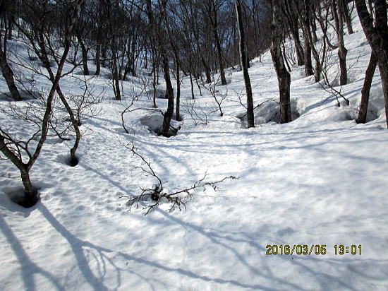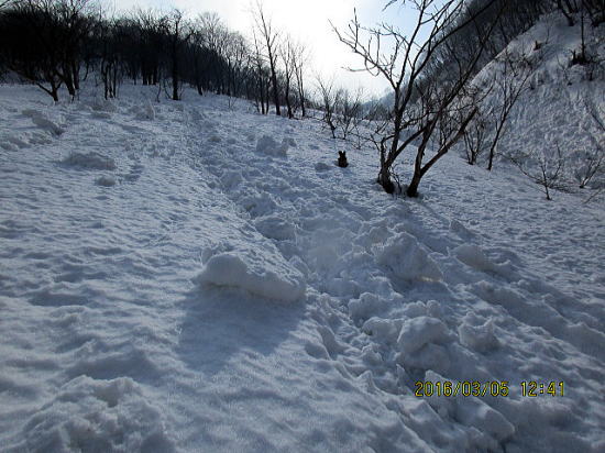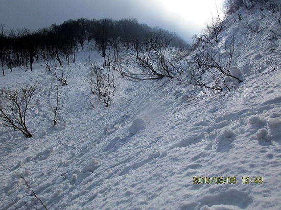 | またまた、いい斜面と思って滑り出すとデブリがでます。標高1050mを折り返し地点としました。 | 左斜面がスキーを滑らせたところですが小デブリが出まくりです。 |