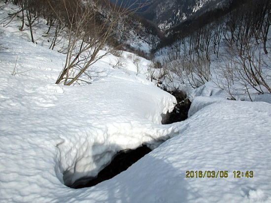 | ちょうど沢割れ開始地点の上で左岸に渡りました。 | 振り返ると・・・スピーディーな行動が必要ですが。 |