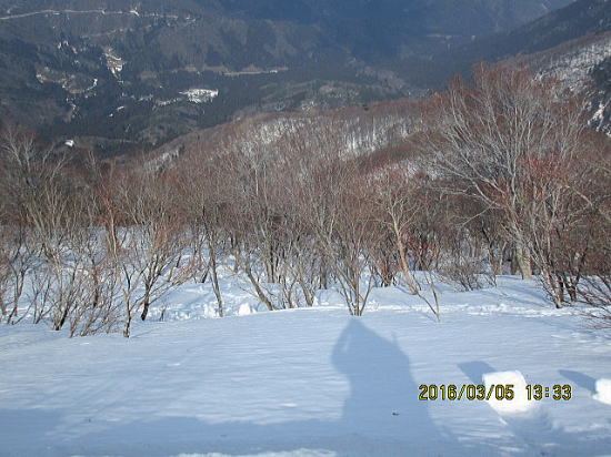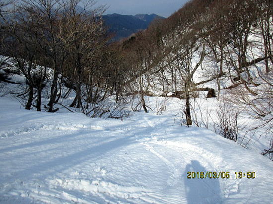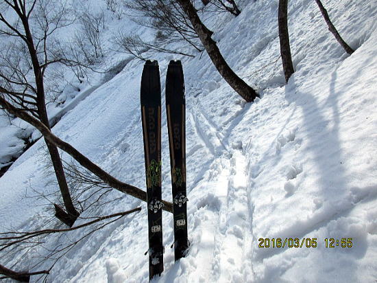 | 小さな雪片でも斜度があるところは大きなカタツムリとなります。先週以前なら、かなり快適斜面でしょう。対岸↓が登り返しに良さそうです。 | 湿雪重雪、クラストのカチカチよりは操作しやすい。 |