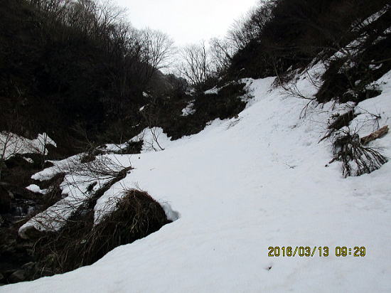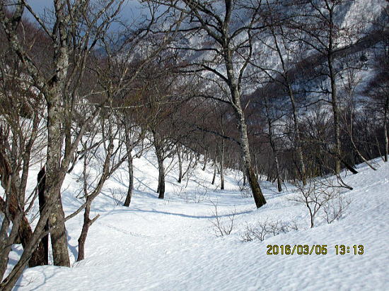 | ヤブと広目のバーンが交互に出てきてあきません。 | 沢が広く渡渉することなく左岸を下っていきます。 |