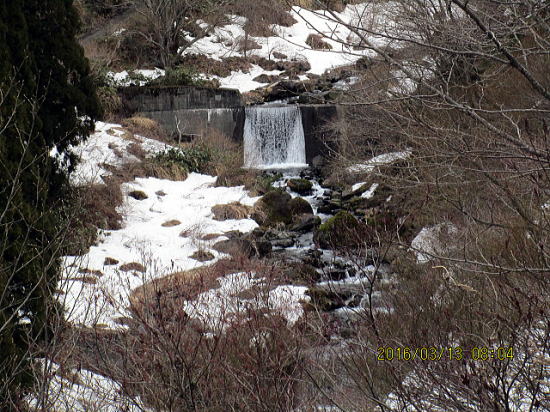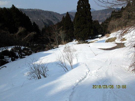 | 今日はたっぷり滑ったので潔く、650m地点で担いで進み尾根道に合流しました。再奥が前山です。 | 当初帰路予定の水車小屋も雪はありません。こちらもかなりの担ぎの覚悟が必要です。 |