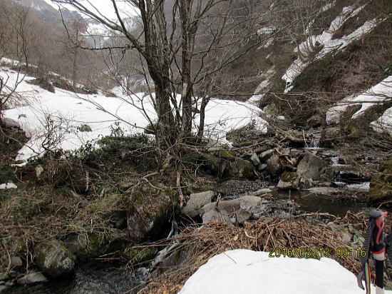 | 雪は少ないが上部に行けばよいだろうと担いで歩きます。 | 最初の渡渉、これまでは左岸をそのまま行った気がしますが、雪がなくまた右岸に戻ります。 |