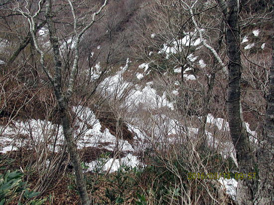 | 滝場です。壺足で越えます。この後渡渉し両岸の雪が消えます。 | やむなく左岸のルンゼを詰め林道をめざします。しかし汗だくになっても林道に到達できず、断念。ここを降りるのもバックステップとウイペット併用で緊張を強いられました。 |