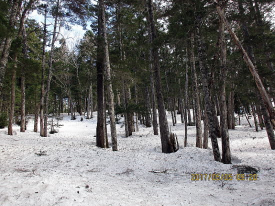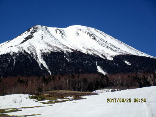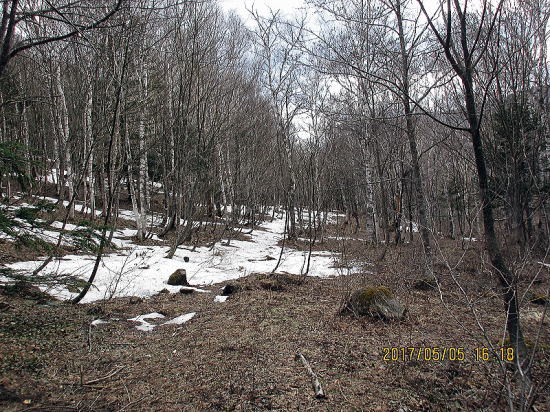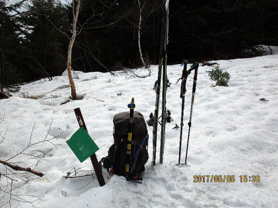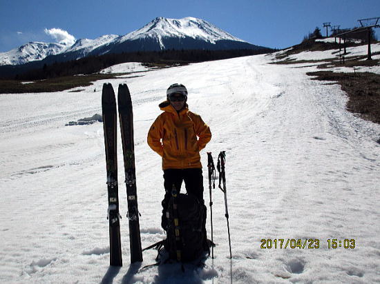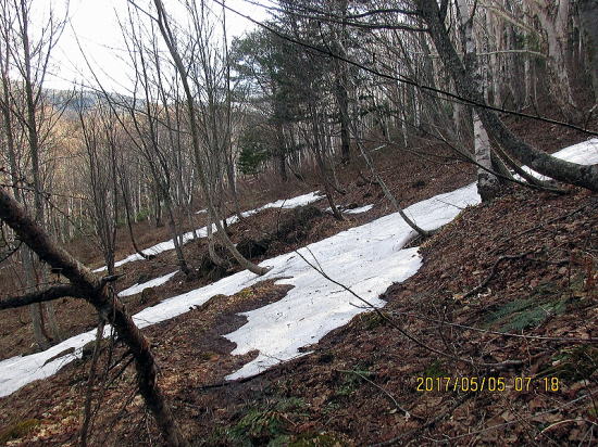 | 下降の滑りと歩きが約1.5時間というのもGWならでは。ドアtoドアがなつかしい。シラカンバの中を進む。この後も笹押さえの雪が融けて笹がたち通過に難儀すること数回を通して無事完了。残りのGW楽しむぞ。 |