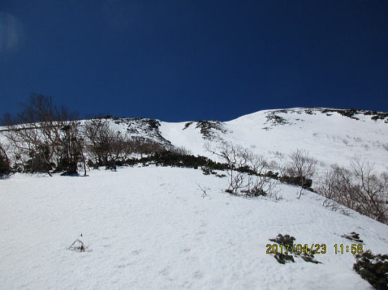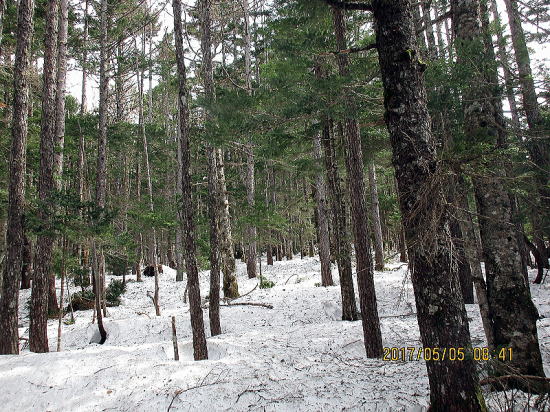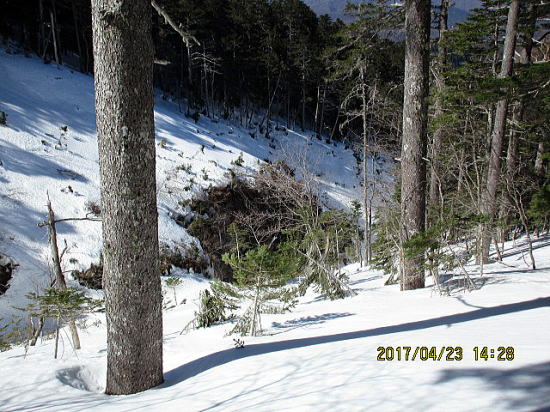 | ようやくゲレンデトップが見えてきました。 | 2140mのゲレンデトップから2500mまでが 樹林帯になります。今年は雪が多いため林間も広々しています。シールに雪が付き下駄になり苦戦をします。 |