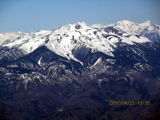 | 振り返ると御岳山です。継子岳もよくわかります。左がマイア、右がチャオスキー場です。 | 大日岳と剣ヶ峰ひょっとしたら13時着かと思いましたがさらにかかります。 |