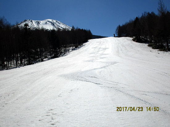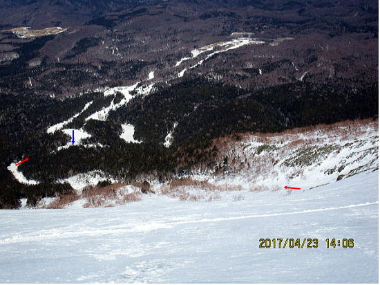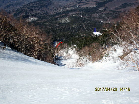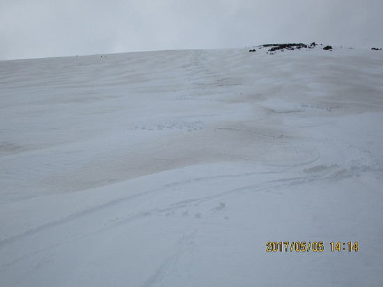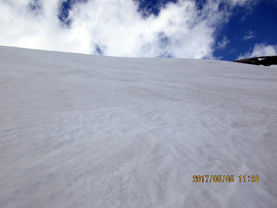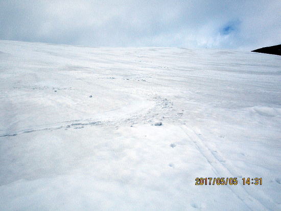 | 2600m付近からクラストバーンからザラメに変わってきました。これからの進路です。↓がゲレンデトップです。 | 表面がうっすら融けているだけで下はアイスバーンです。今季初のびびり、ゆったリターンです。 |
