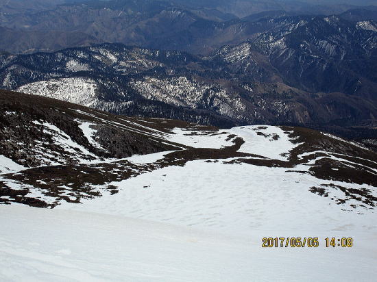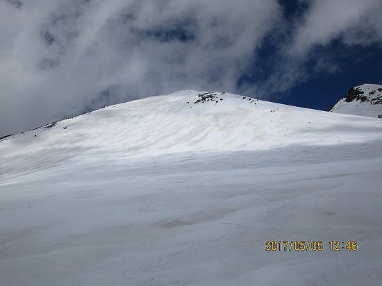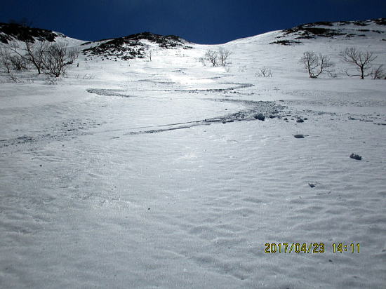 | ようやく少し緩んできました。少しターンがしやすくなりました。 | 谷部に入り、2500m以下は締まったザラメ雪で快適滑降となりました。 |