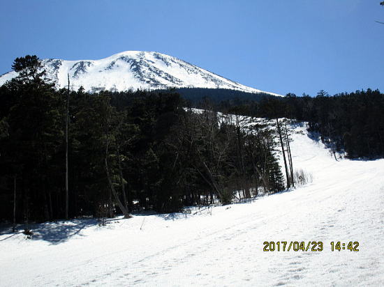 | 九蔵峠展望台から、畏敬の念を抱かされます。左奥:剣ヶ峰、中央:摩利子天、右端:継子岳。 | マイアスキー場を出発します。シーズン終了したゲレンデは雪が多く、最初よりスキーで進めます。 |