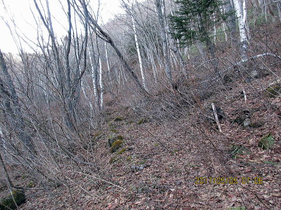 | 旧登山道はブッシュと笹におおわれることがしばしば、痛めた膝靱帯が気になります。 | 雪が出てきてもつながる気配はありません。 |