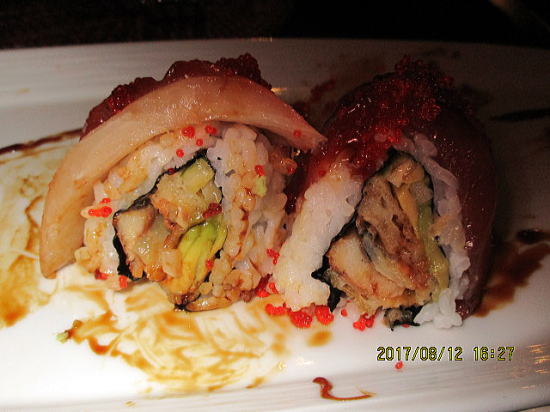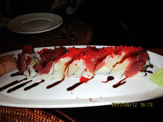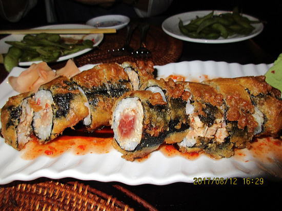 | マウイカフルイ空港到着後、14時半にレンタカーを予約してあるので借りましたが盲点がありました。コンドとセットで割引があったのですが、任意保険までは確認せず、英語でのやりとりでもよくわからず、日本の自動車保険のシステムと似ているところと違うところがあるということで保険選びにへとへとになってしまい、夜メニューは考える余地もなくコンド前のカフェ・オーレ寿司バーでスペシャルロールとツナ巻きあげロール(名前忘れた)をオーダーしました。 | スペシャルロールはロールの外側をマグロとハマチで巻いてあります。中心にはアボガド、うなぎの天ぷら、キュウリがあり、照り焼きソースの味で日本人好みの味でしょう。いろいろな味が混ざって美味でした。 |