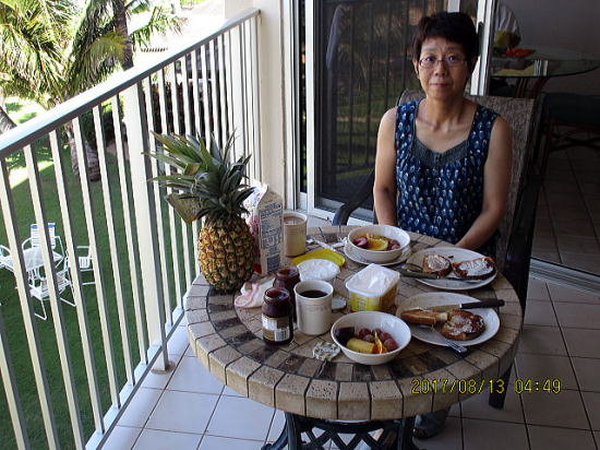 | 朝食はテラスで。昨夕買い出しに行ってきました。のんびり朝食10時です。 | まだ来たばかりで戸惑いばかりです。リピーターですが、車任意保険で気を遣いすぎました。 |