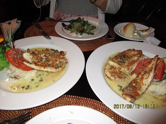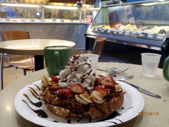 | 昼食は、ベルギーワッフル店でオーダーは「ハレアカラ」ハレアカラ山をイメージしたものです。シェアして食べました。アイスも各種あります。 | 夕食はカフェオーレでEntrees(仏語でアントレ-:メイン料理)はマカデミアンナッッツ・クラステッド・チキンです。ナッツ入りソースがクリーミーですっぱめで食が進みます。19.95ドル。(税抜き、チップ抜き)+6.5ドル(シェア分) |