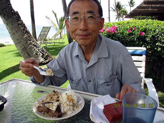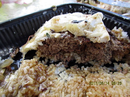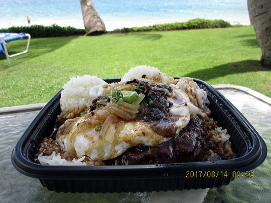 | 体が冷えて退散です。アクティビティ船は11時頃きました。グアムで経験しましたが与えられる弁当より、好きなものを店でチョイスは楽しいです。 | 本日は DA KITCHENでロコモコをテイクアウトし、コンド前の芝でランチしました。14.79ドルですがシェアしてもライスがあまりました。説明では80%赤身牛肉バーガーに2個の半熟目玉焼き、タマネギとマッシュルームとグレービーソースです。 |