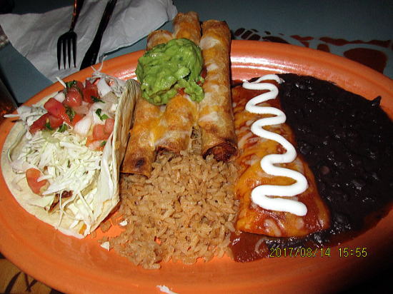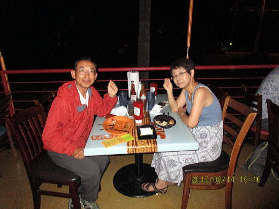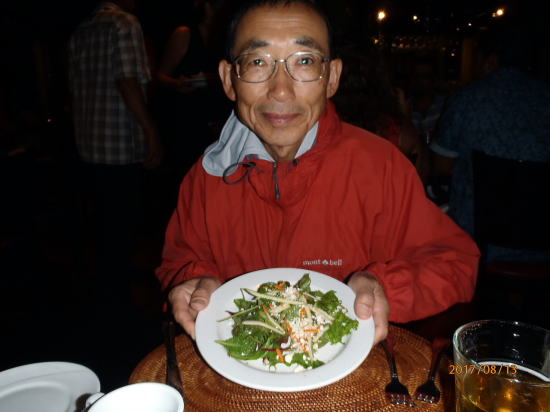 | 夕食はフレッズ・メキシカン・カフェです。左からチキンタコス、メキシカンライスとチキンタキートス(小さめのトウモロコシで作った生地トルテーニャで鶏肉などの具の巻物を揚げたもの、揚げ春巻きに似ているが中は肉ぎっしり)、チキンエンチラーダ(チキン具材をトルテーニャで包んで唐辛子のソースなどをかけたもの)、ブラックビーンズ(インゲン豆の塩ゆで味)・・・食感や味が似ている中、豆が一番はっきりした味でした。 | オープンカフェ(テラス席)は涼しく、寒すぎず気分が良いです。 |