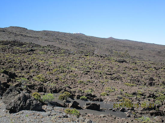 | 10:11 標高2750m地点。ようやく単調な登りから解放されそうです。 | 10:21 溶岩流(ラバ・フロー)で荒涼としているところは富士山5合目以上に似ています。白い建物は山頂の観測所です。 |