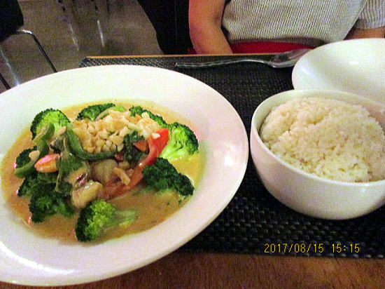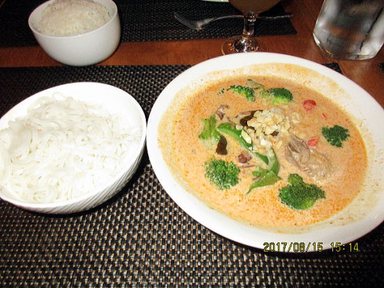 | 夕食はタイ料理料理、お店お勧めのマカデミアンナッツ・カレー(辛さミーデアム)with リブ肉(牛肉すじ煮込み)とライスヌードルです。ライスヌードルはご飯より軽くていけました。 | パートナーはマカデミアンナッツ・カレー(辛さマイルド)with シュリンプ(えび)とライスです。 |